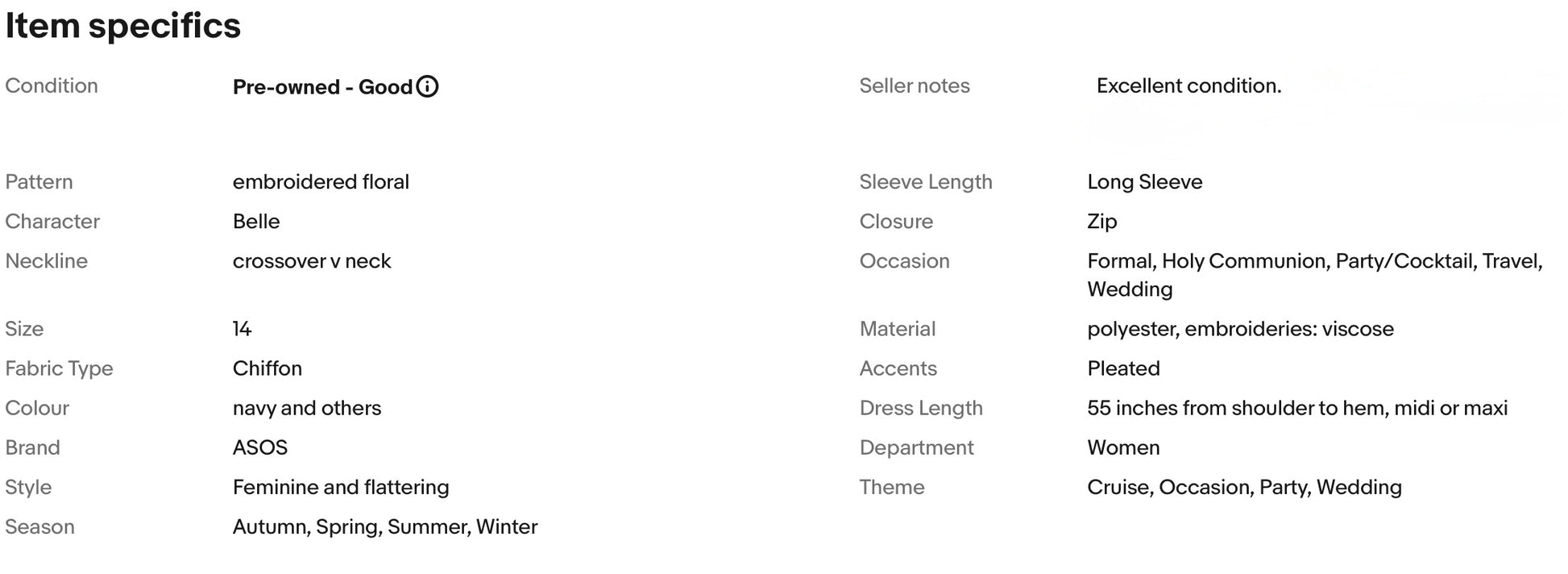 A stunning dress from ASOS. It features flattering crossover v neckline, gorgeous embroidered floral pattern, nipped in waist, pleated skirt falls to glamorous midi or maxi length.