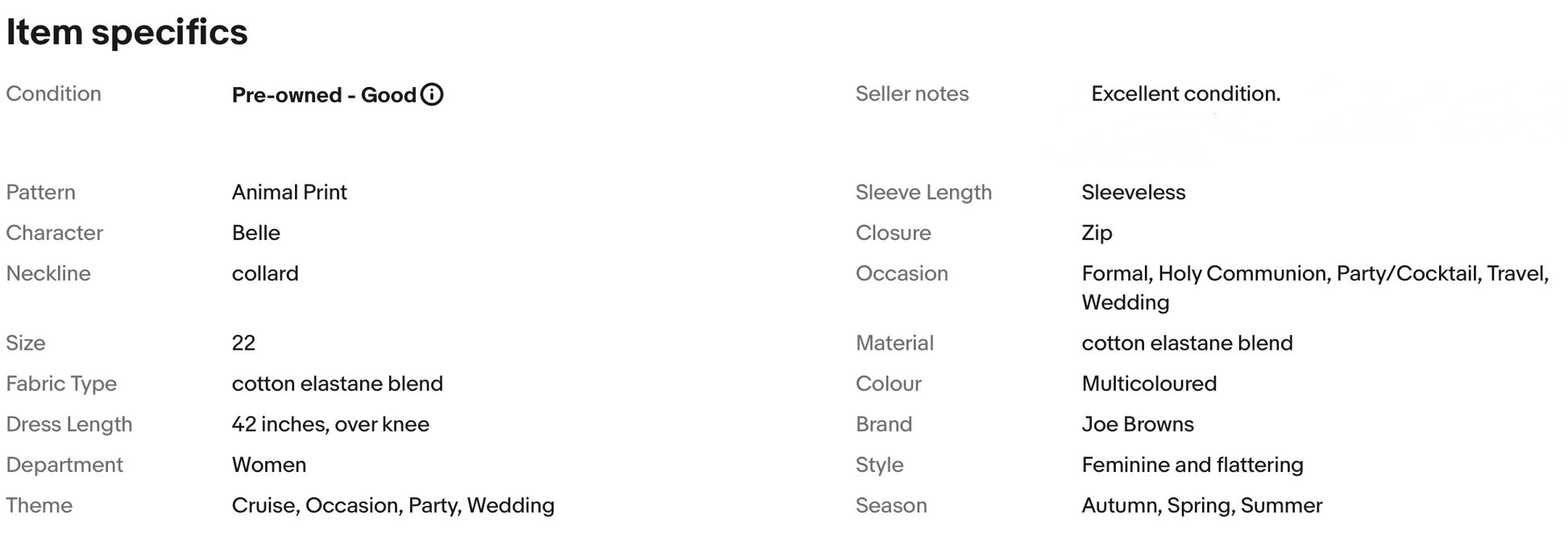 A stunning dress from Joe Browns. It features collared neckline, gorgeous animal print, buttons at front and zip at back, nipped in waist, falls to glamorous over knee length.