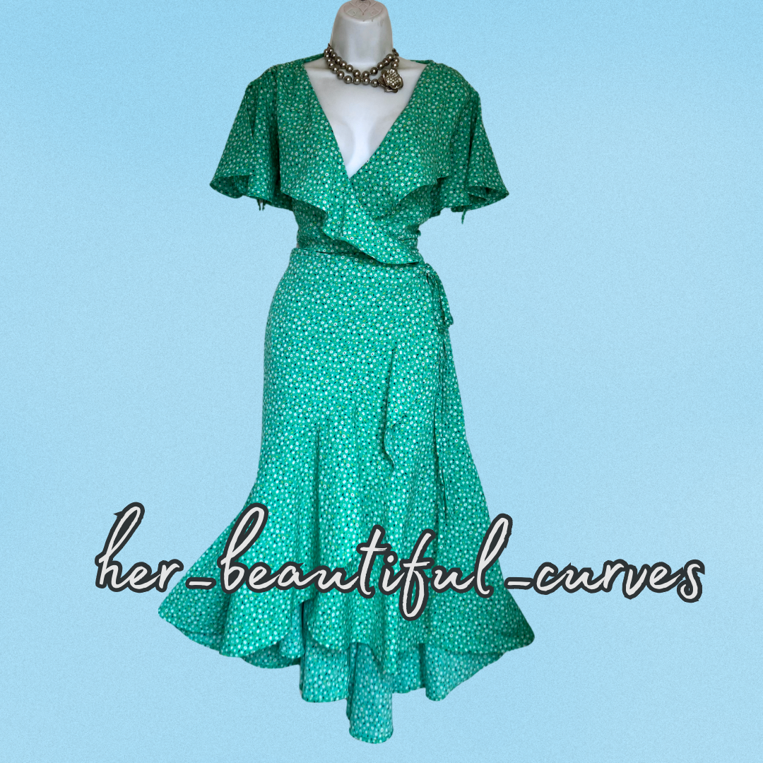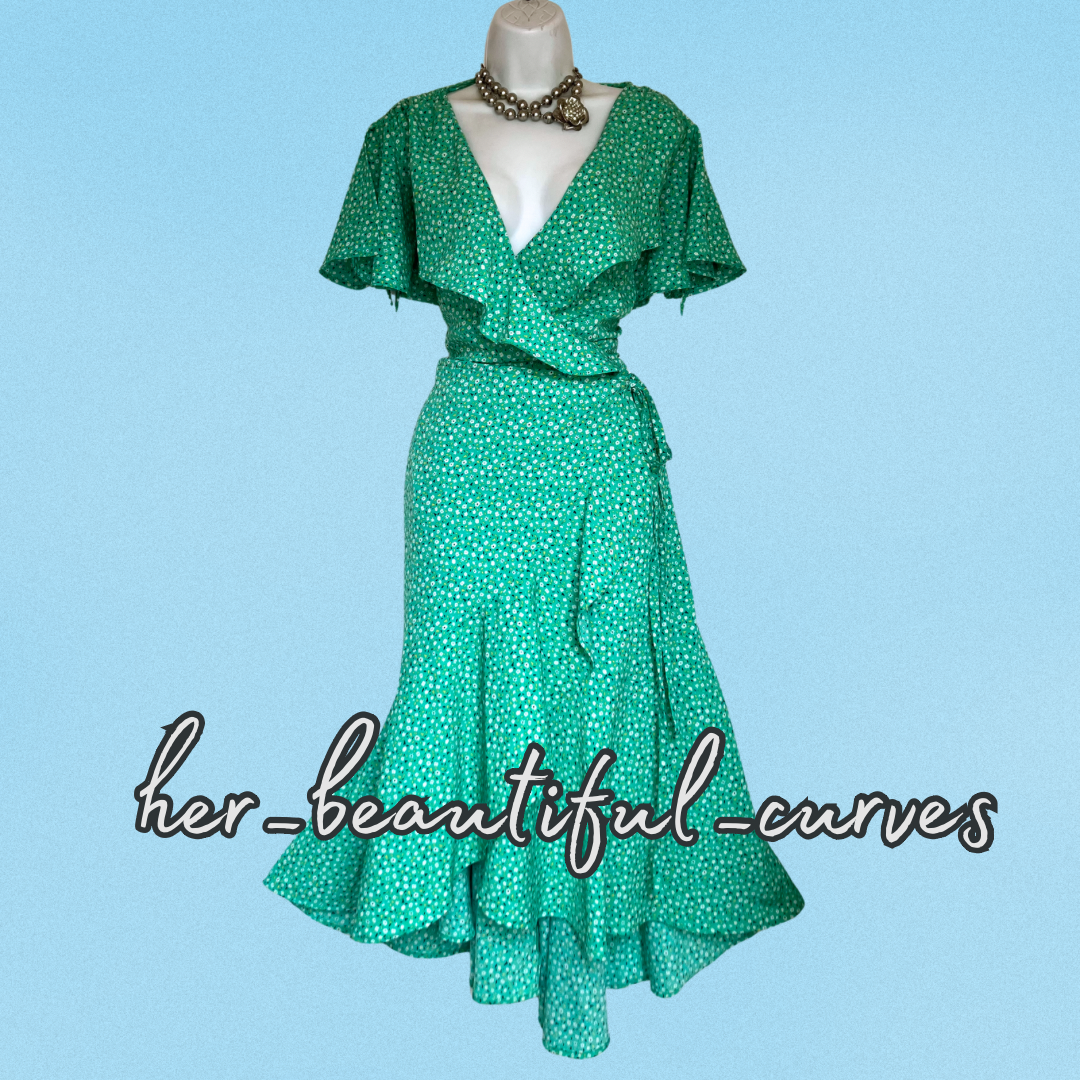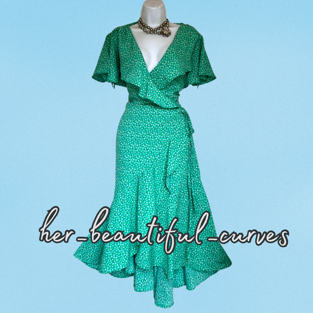 A stunning dress from Joe Browns. It features flattering crossover v neckline with frills, gorgeous ditsy floral print, it is wrapped over then secured by tie belt, falls to glamorous midi length.