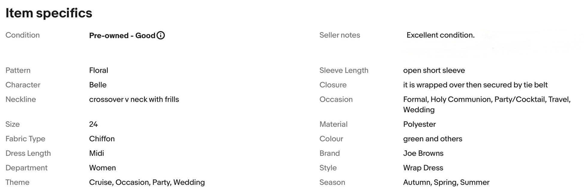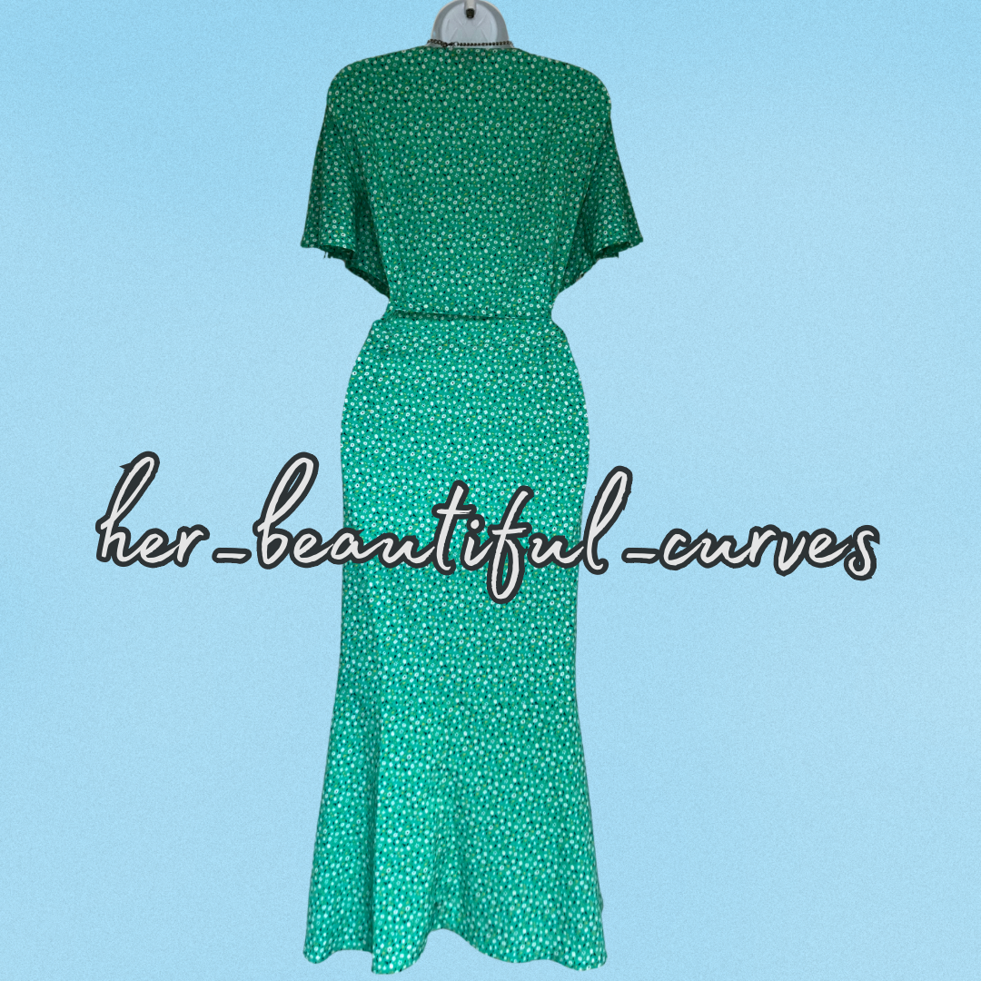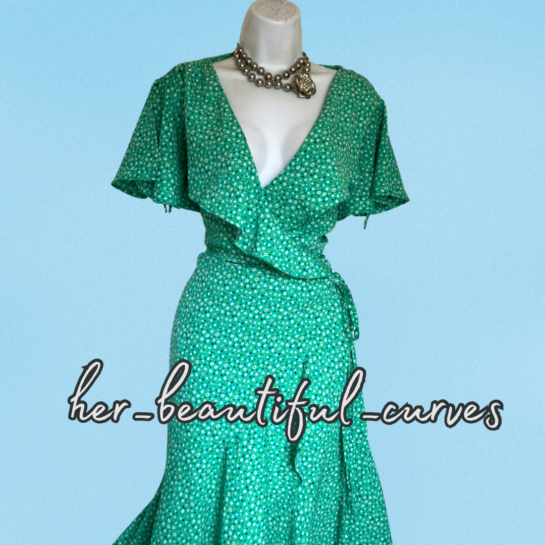 A stunning dress from Joe Browns. It features flattering crossover v neckline with frills, gorgeous ditsy floral print, it is wrapped over then secured by tie belt, falls to glamorous midi length.