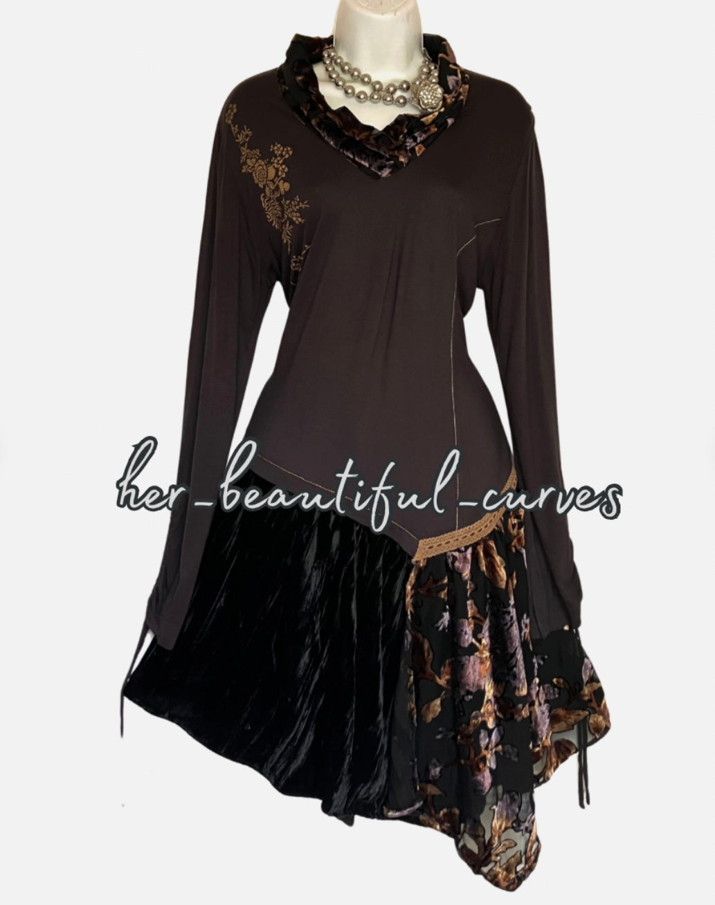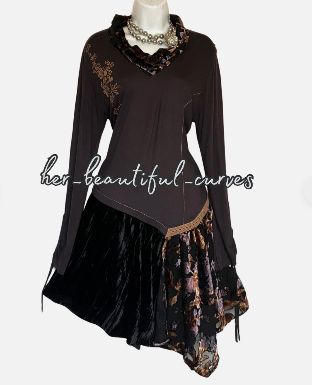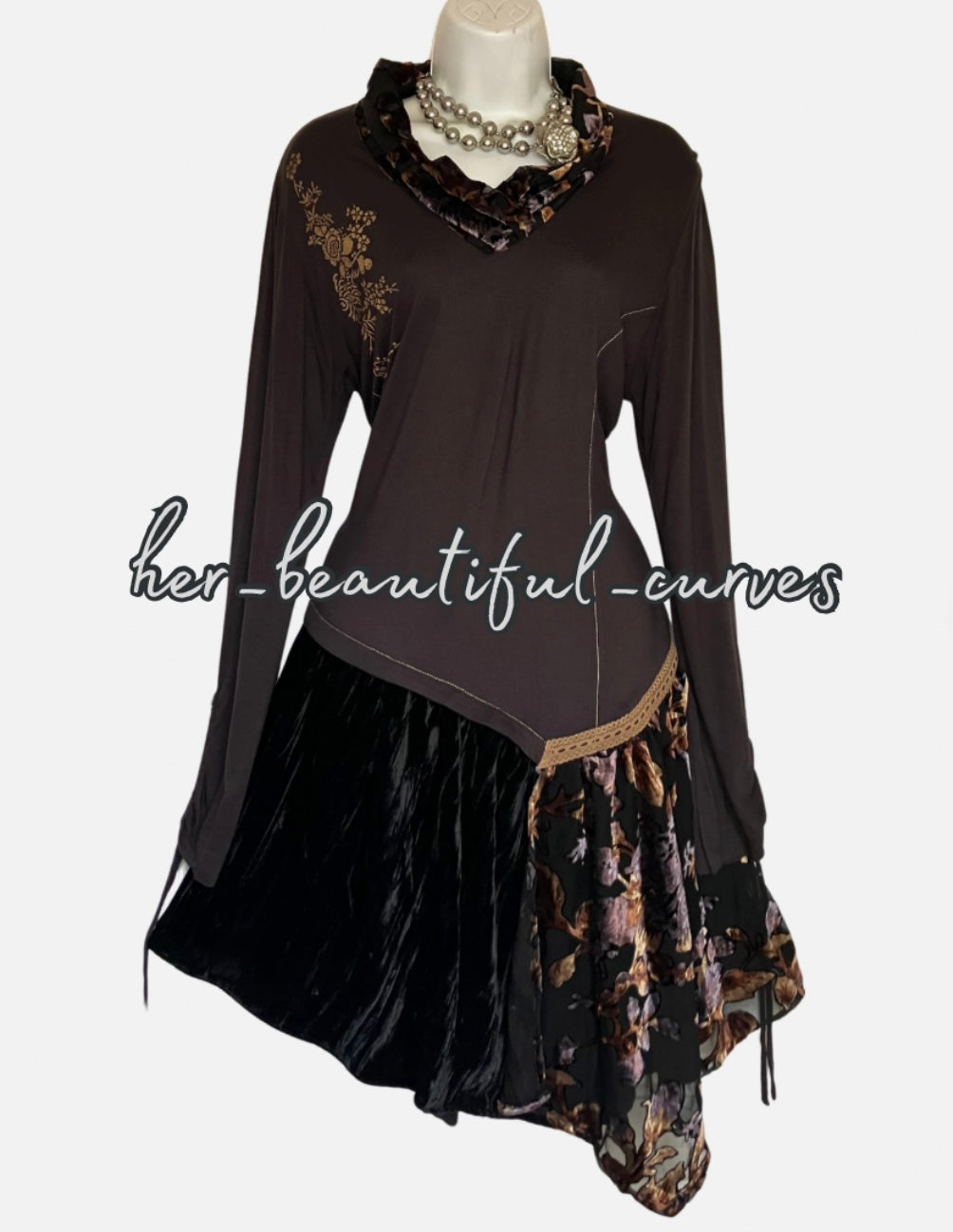 A stunning dress from Joe Browns. It is preloved, in excellent condition. It features cowl neckline, floral pattern, embroidered trims, ruched sleeves with strings, falls to playful short length with hanky hem.