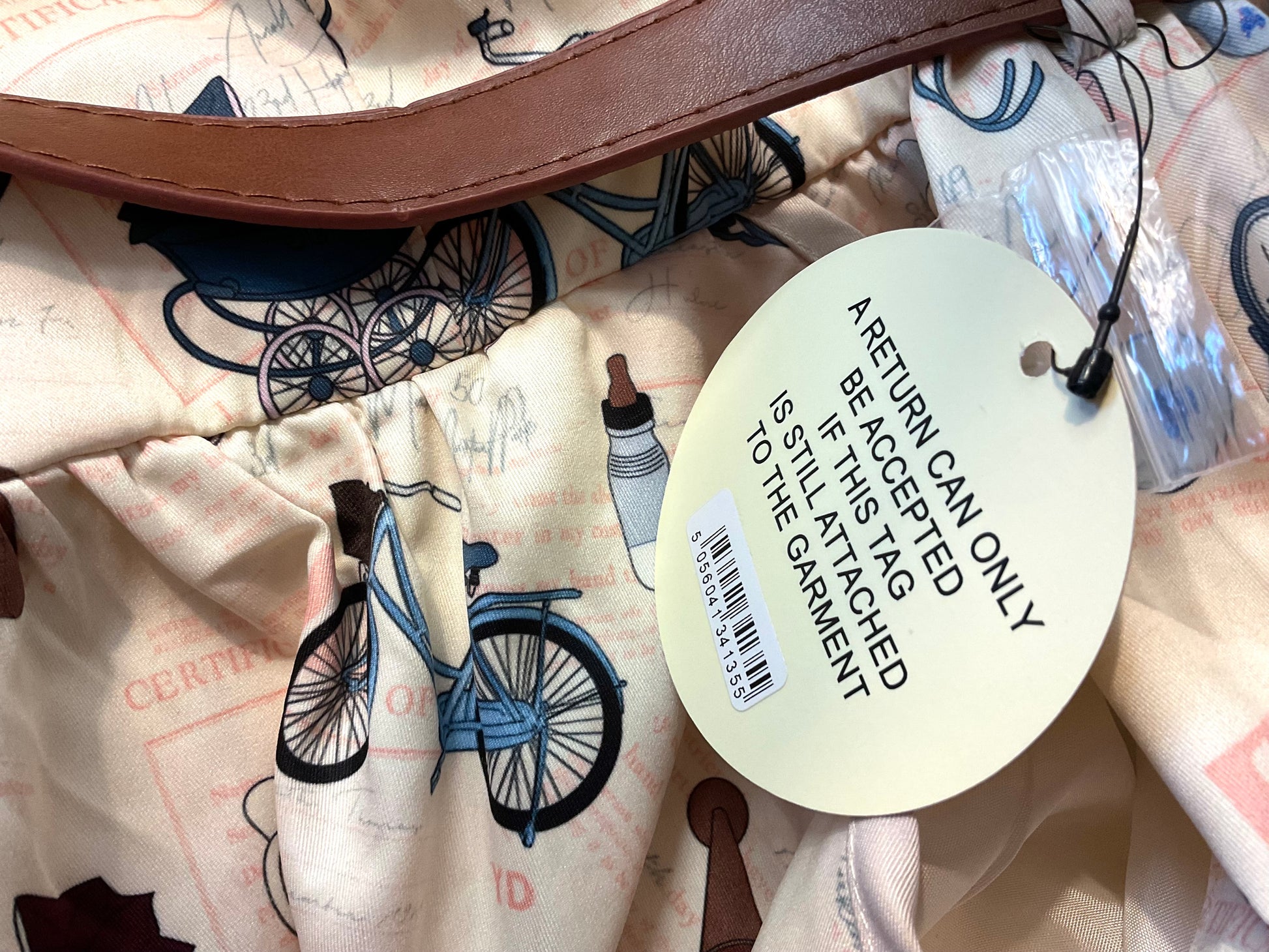 A stunning dress from Lindy Bop. It is new with tags. It features collared neckline, cute nursery theme print, buttons at front, zip closure at side, belt highlighting perfect feminine silhouette, side pockets for convenience, falls to glamorous over knee length.