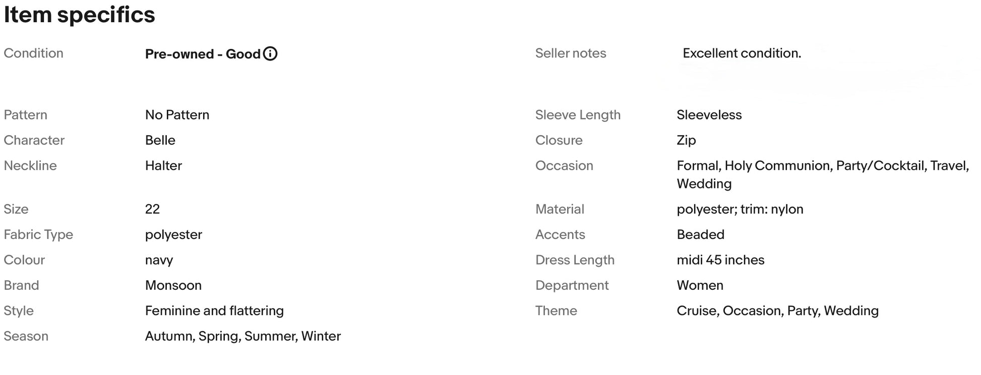 A stunning dress from Monsoon. It is preloved, in excellent condition. It features flattering halter neckline, shimmering beads around neckline and waist, nipped in waist, falls to glamorous midi length.