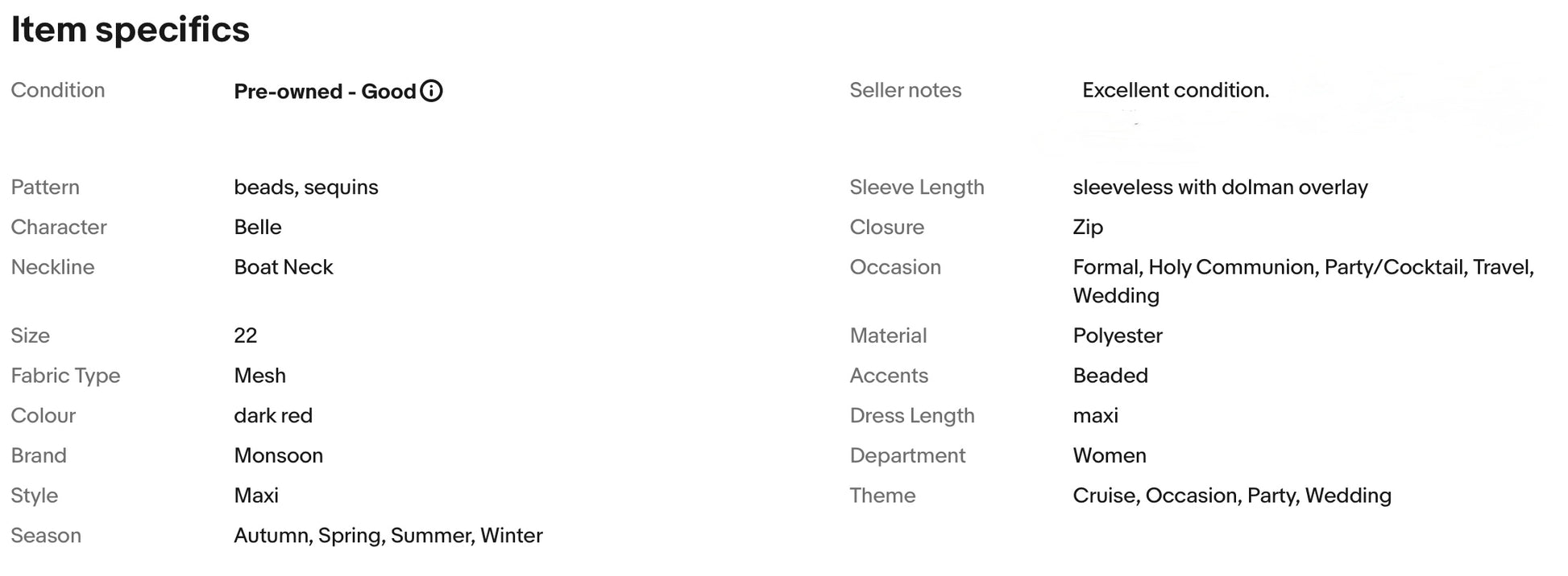 A stunning dress from Monsoon. It is preloved, in excellent condition. It features flattering boat neckline to the front and v neck to the back, gorgeous shimmering sequins and beads, dolman overly design, nipped in waist, falls to glamorous maxi length.