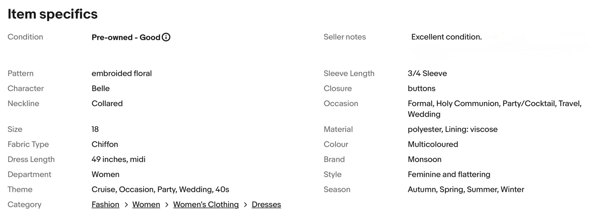 A stunning dress from Monsoon. It features collared neckline, gorgeous embroidered floral pattern, buttons at front, nipped in waist, falls to glamorous midi length,