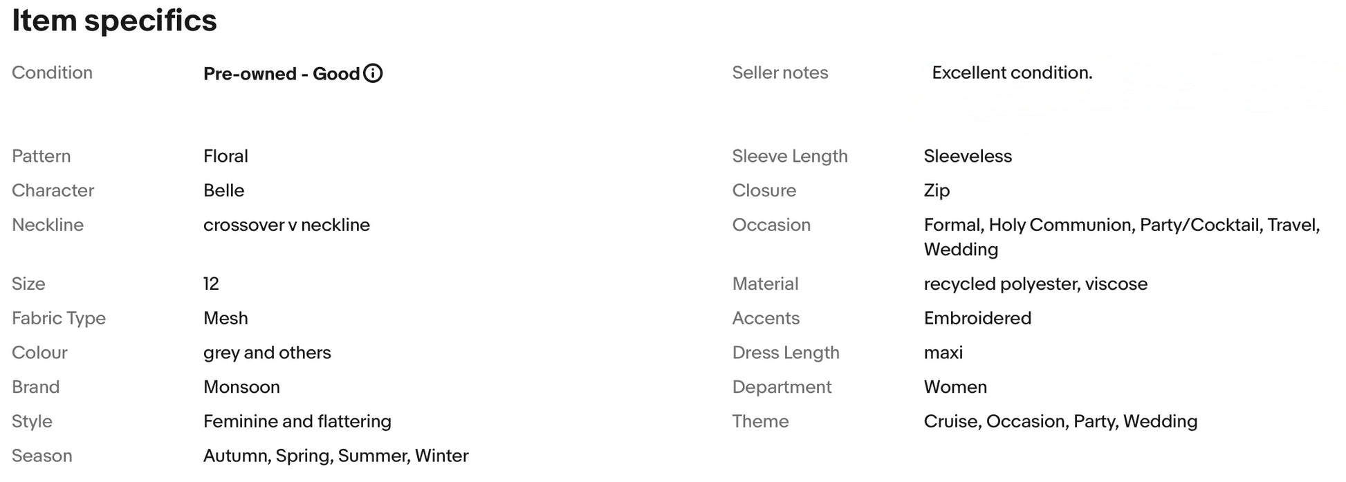 A stunning dress from Monsoon. It features flattering crossover v neckline, beautiful and delicate embroidered floral pattern, nipped in waist, falls to glamorous maxi length.
