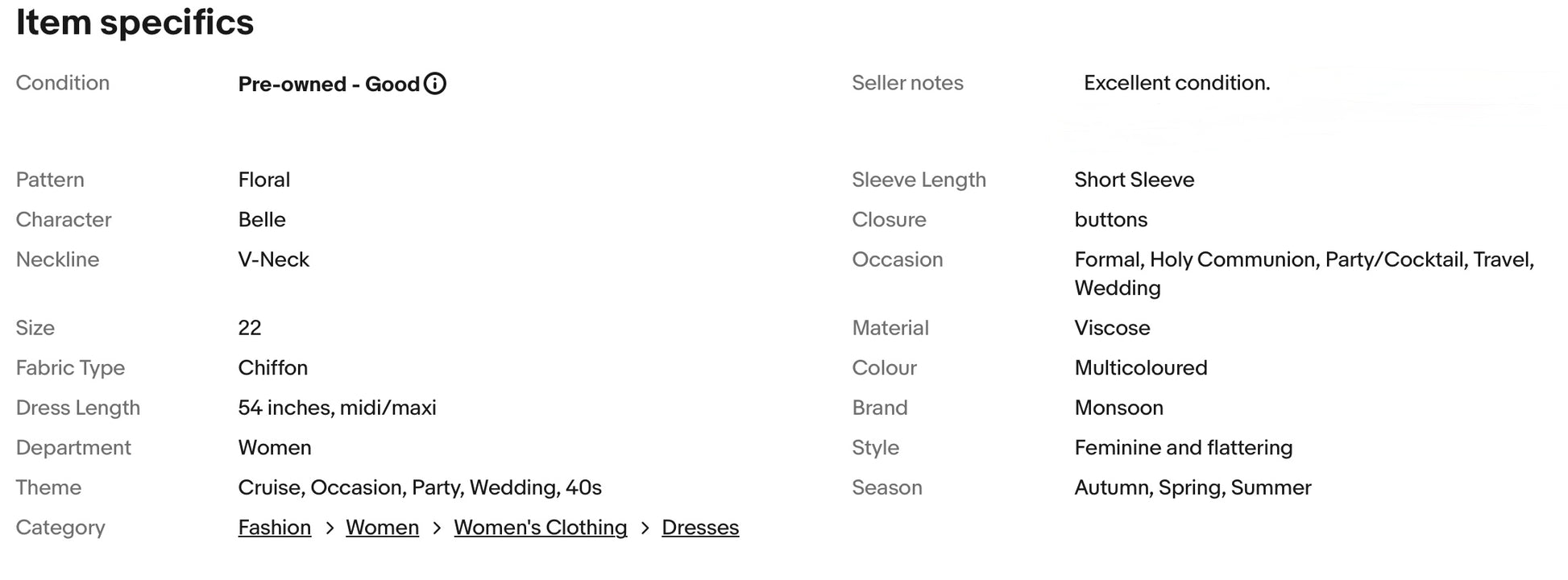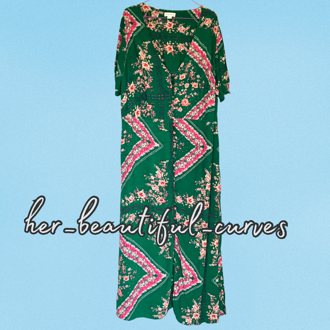 A stunning dress from Monsoon. It features flattering v neckline, gorgeous floral print, buttons at front, elastic back waist, side slits, falls to glamorous midi/maxi length.
