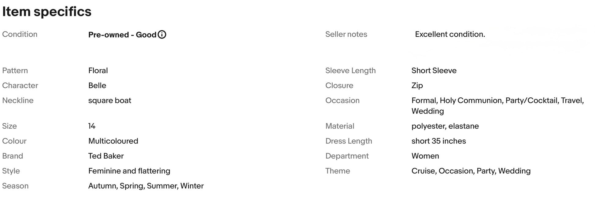 A stunning dress from Ted Baker. It features flattering square boat neck, gorgeous floral print, nipped in waist, falls to playful short length. It is Ted Baker Size 4 UK size 14.
