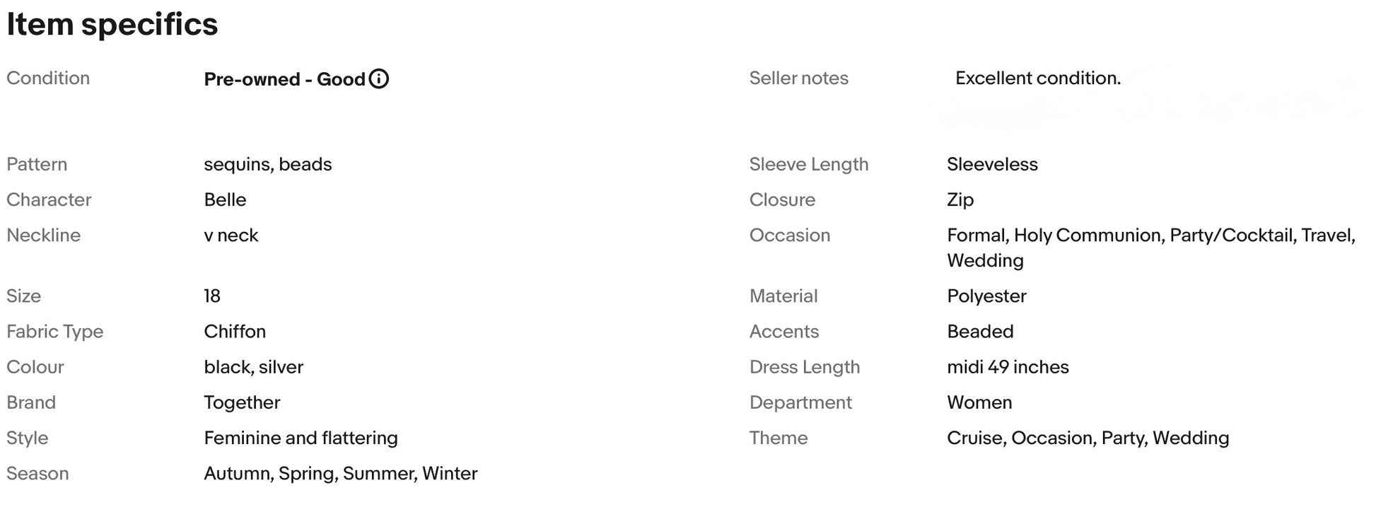 A stunning dress from Together. It is preloved, in excellent condition. It features flattering v neckline, gorgeous shimmering silver beads and sequins, falls to glamorous midi length.